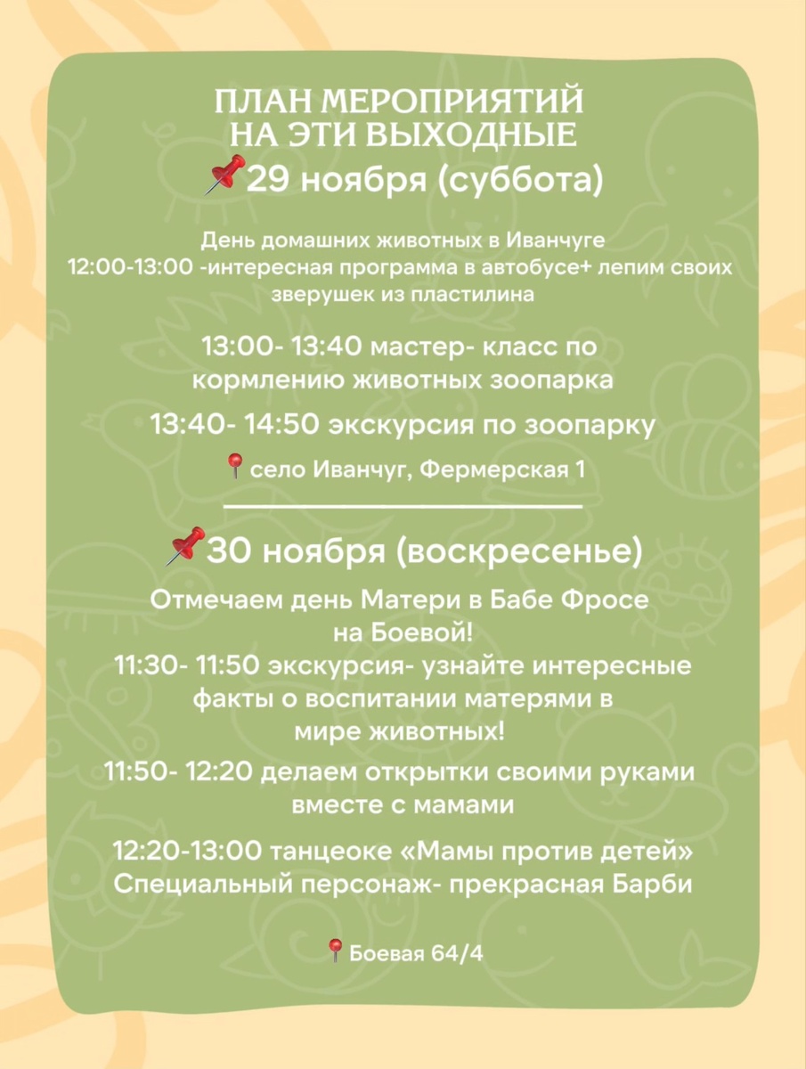 🦊🍁План мероприятий на выходные в зоопарке «Баба Фрося»! 🍁🐻 Суббота, 29.11: День домашних животных в Иванчуге 📌 12:00-13:00 -интересная программа в автобусе+ лепим своих зверушек из пластилина 📌 13:00- 13:40 мастер- класс по кормлению животных зоопарка 📌 13:40- 14:50 экскурсия по зоопарку 🎫Стоимость билета на мероприятие-200₽. Места ограничены. Для записи звоните нам 📱 +7 (967) 829-73-00 📍с.Иванчуг, ул. Фермерская,1 🕒Начало 12.00 Воскресенье, 30.11: Отмечаем день Матери в Бабе Фросе на Боевой! 📌 11:30- 11:50 экскурсия- узнайте интересные факты о воспитании матерями в мире животных! 📌 11:50- 12:20 делаем открытки своими руками вместе с мамами 📌 12:20-13:00 танцеоке «Мамы против детей» Специальный персонаж- прекрасная Барби 📍ул. Боевая 64/4 🕓 Начало 11.30 📅 Ждем вас всей семьей! 📍 Где: зоопарк «Баба Фрося» 🔖 Мероприятия 30.11 входят в стоимость билета