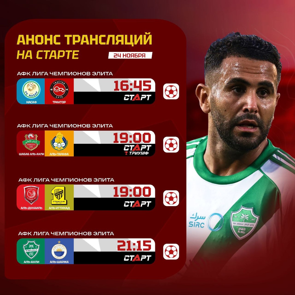 👀🏆 Футбольный понедельник на платформе TVSTART.RU! Начинаем пятый тур АФК Лига Чемпионов Элита. «Насаф» пока без очков и для продолжения борьбы за плей-офф команде из Узбекистана нужна победа над «Трактором». «Аль-Гарафа» Хоселу сыграет в Дубае с «Шабабом Аль-Ахли». «Аль-Духаиль» Верратти и Пентека попробует остановить «Аль-Иттихад» Карима Бензема. Ну и завершит день сражение «Аль-Ахли» Рияда Мареза против «Аль-Шаржи» Сауля Гуарирапы. Оставайтесь весь день на платформе TVSTART.RU 🖥 🛒 Наше приложение в Google Play 💙 Наше приложение в RuStore 🛒 Наше приложение в App Store