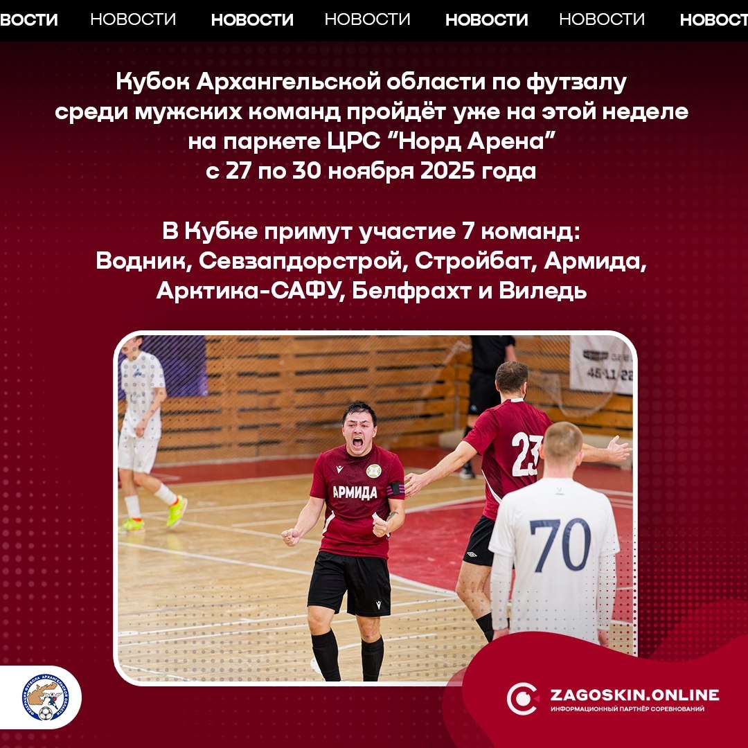 🔥 Кубок Архангельской области по футзалу среди мужских команд пройдёт в Архангельске с 27 - 30 ноября 2025 на паркете ЦРС "Норд Арена". #новости #zagoskin_online #футзал #кубокАО #сезон25_26