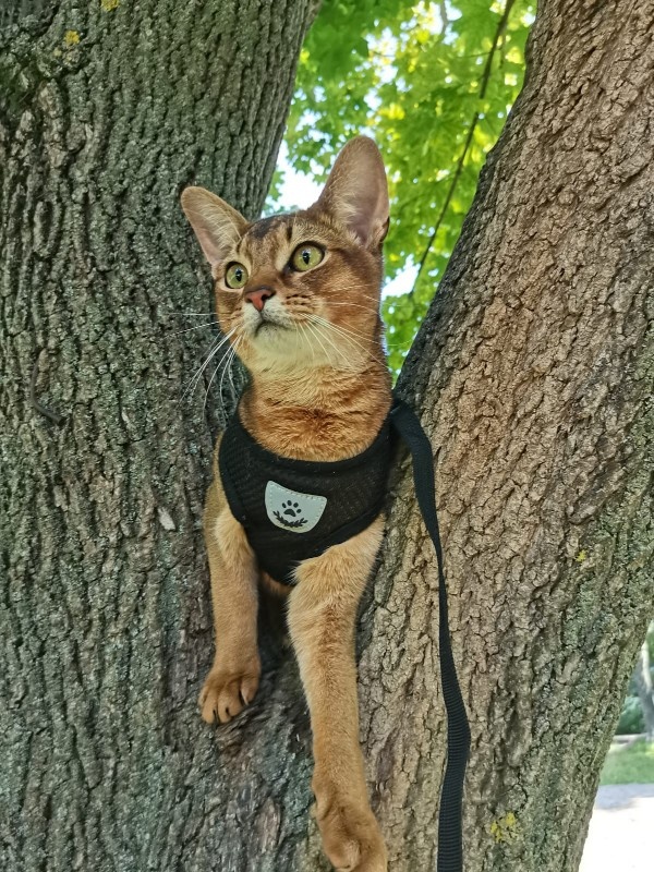 Потом он потихоньку идет в сторону берега реки Цны, она у нас сразу за домом. Иногда, по пути может увидеть птичек, и податься на дерево, пытаясь их поймать. Это может затянуться и на пол часа и даже дольше. Сидит, выслеживает добычу, и когда птица улетает, спускается. Поначалу , когда он забирался на высоту 20–30 метров, становилось страшно, и я звал его вниз. Но какой может быть низ, когда перед глазами возможно будущая добыча?
