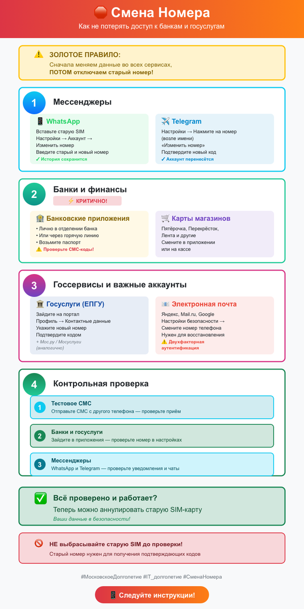 Смена номера телефона кажется простой: купил новую SIM-карту и пользуйся. Но ваш старый номер — это ключ к вашей цифровой жизни: мессенджеры, почта, банки, порталы госуслуг. Если старую SIM-карту выбросить до того, как перевязаны все сервисы, можно навсегда потерять к ним доступ. ⚠️ Золотое правило: сначала меняем данные, потом отключаем старый номер! Ни в коем случае не аннулируйте и не выбрасывайте старую SIM-карту, пока не завершите все шаги ниже. Старый номер нужен для получения подтверждающих кодов. Шаг 1: Мессенджеры (WhatsApp и Telegram) Вам не нужно удалять приложения, чтобы поменять номер! • WhatsApp: • Вставьте старую SIM-карту в телефон. • Зайдите в Настройки → Аккаунт → Изменить номер. • Введите старый и новый номера. WhatsApp сам перенесёт всю историю ваших чатов на новый номер. • Telegram: • Зайдите в Настройки → Нажмите на свой номер телефона (возле имени). • Выберите «Изменить номер». • Введите новый номер и подтвердите его кодом, который придёт на этот новый