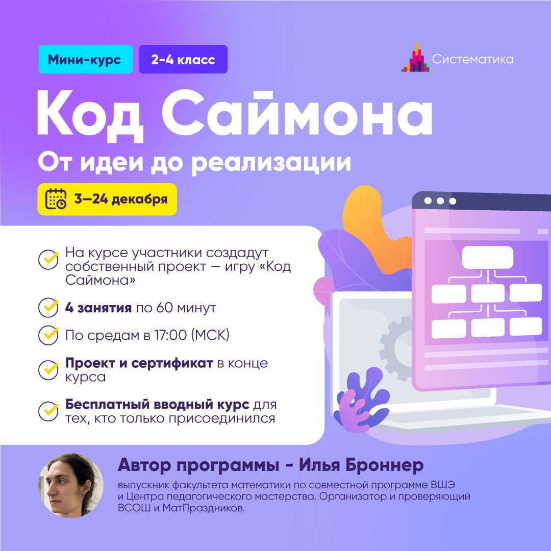 👾 Создаём популярную цифровую игру сами! 👉По средам в 17:00 с 03.12 по 24.12 👉Для 2-4 классов 👉Зарегистрироваться ❗️Тем, кто планирует присоединиться сейчас, рекомендуем пройти бесплатный вводный курс «Scratch для начинающих» Создадим цифровую игру на развитие памяти! На курсе освоим списки, условия и логику программирования. ✅Подходит для учеников 2-4 класса ✅Будем работать в визуальной среде Scratch («блочное» программирование) ✅Итогом курса станет создание собственной игры ✅На курсе ребенок освоит базовые навыки программирования Это 3 модуль годовой программы направления • 7 мини-курсов, 36 занятий • Каждый модуль — самостоятельная и завершённая тема и проект, вместе они дают полноценную систему знаний по Scratch • Можно проходить отдельно или целиком Scratch — как конструктор, но для программирования. Это отличный старт для новичков! • 4 онлайн-занятия по 60 минут • 20 минут теории в увлекательной форме • 40 минут практики — дети создают свои проекты, задают вопросы и по