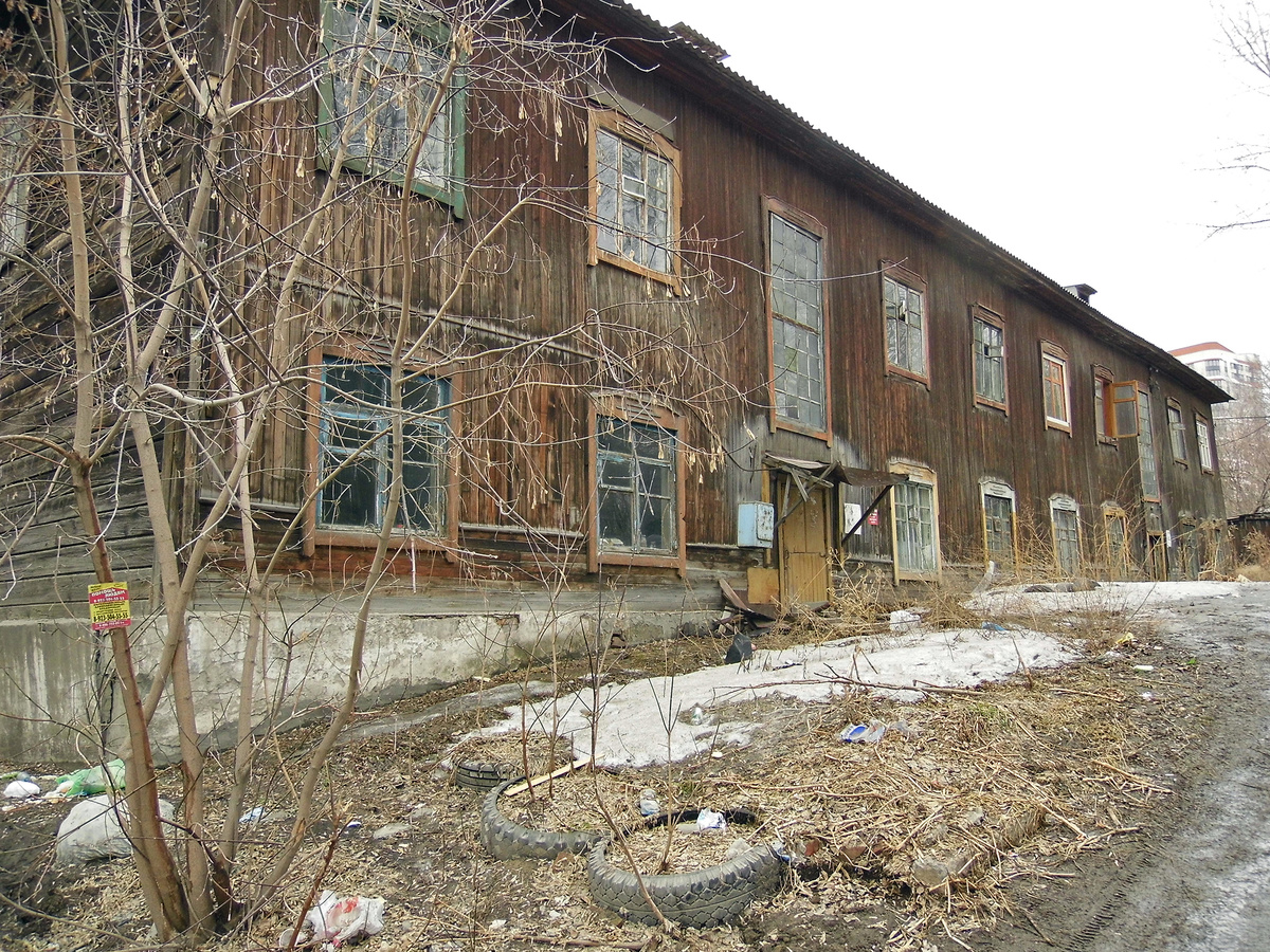 Старый деревянный двухэтажный дом, располагавшийся на Чернышевском спуске, привлёк моё внимание весной, когда я случайно проходил мимо. Ещё издали он показался мне каким-то безжизненным и заброшенным, и я решил подойти к нему поближе, чтобы рассмотреть… Предчувствия меня не обманули. Отсутствие протоптанных дорожек, оборванные провода, распахнутые настежь окна и форточки, раскиданный повсюду мусор – совершенно случайно я обнаружил ещё один расселённый дом. В глаза сразу же бросилась необычно низкая дверь в подъезд, которая, к сожалению, оказалась закрыта. Честно сказать, путешествия по заброшенным местам в тот день не входили в мои планы, но раз уж я нашёл этот дом, то почему бы не заглянуть в него хоть краем глаза? Обойдя здание с другой стороны, я увидел куда более удручающую картину. Одно из окон на втором этаже (вверху слева на фото) было заколочено фанерой, и это показалось мне странным. Кому и зачем понадобилось заколачивать выбитое окно в заброшенном доме, который в скором време