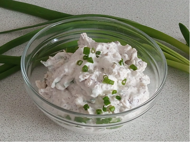 Ингредиенты: - сметана – 3 ст. ложки; - грецкие орехи – горсть; - чеснок – 1 очищенный зубчик; - сыр твердых сортов – 30-40 гр.; - зеленый лук – по вкусу или 1-2 веточки. Грецкие орехи измельчить ножом. Чеснок измельчить ножом или пропустить через пресс. Сыр натереть на мелкой терке. Зеленый лук мелко нарезать. Измельченные ингредиенты добавить к сметане, перемешать, подать к столу. Приятного аппетита.
