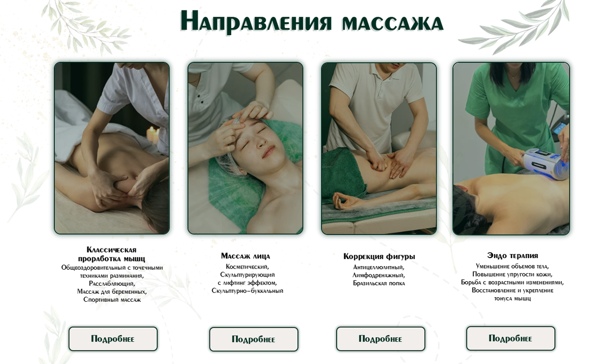 За месяц мы превратили лендинг в полноценный сайт. Добавили нормальные описания услуг: классический массаж, спина, шея, расслабляющий, лимфодренаж, антицеллюлитный — всё по-человечески, понятным языком.