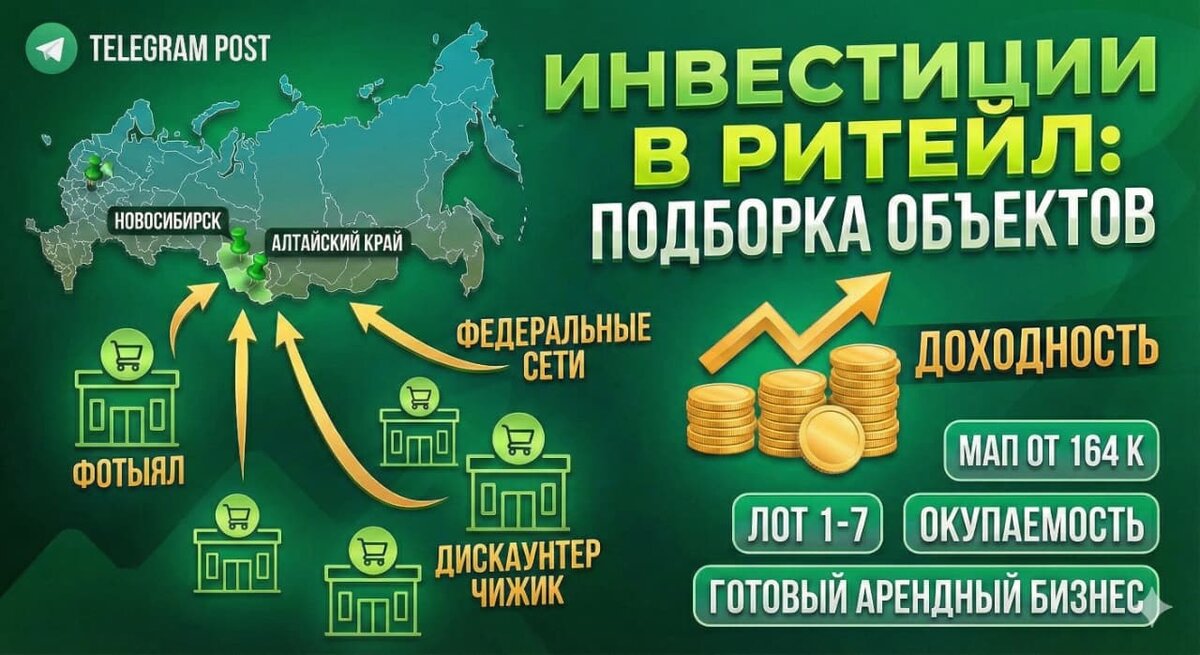 🔥 Друзья, пол дня подбивал эти варианты, чтоб показать вам! 🔥 Собрал для вас 7 максимально жирных лотов - часть уже с арендаторами, часть вот-вот подписываются. Такие объекты долго не висят их забирают быстро. ✅ ЛОТ 1 — “почти готовые деньги” 📍 Новосибирск, 1 этаж, центр крупного спальника 🛒 Арендатор - федеральная сеть «Чижик» ✅ Договор подписан 🛠 Уже идут ремонтные работы 🎄 Открытие – прям под ёлочку к Новому году 💰 МАП: 380 000 ₽ + % от РТО� � Цена: 30 млн ₽ ✅ ЛОТ 2 —решает скорость Новосибирск, крупный спальный район, 2 этаж ТЦ 🛒 Федеральный продуктовый дискаунтер 📈 МАП: 363 000 – 400 000₽ + % (финальная цифра — со дня на день) 💵 Цена: 23 млн ₽ + 2–3млн ₽ на ремонт ⚠️ По лоту уже есть интересант. Объект уйдёт тому, кто быстрее принимает решение ✅ ЛОТ 3 — потенциал 800 000 ₽ чистыми 📍 Новосибирск, крупный жилой массив 📐 Площадь — 826м² 🛒 Подтвержден федеральный арендатор:500 м² = 500 000 ₽ /мес ➕ Остаётся ещё 326 м² на активном трафике 🔥 Потенциальный МАП: до 80