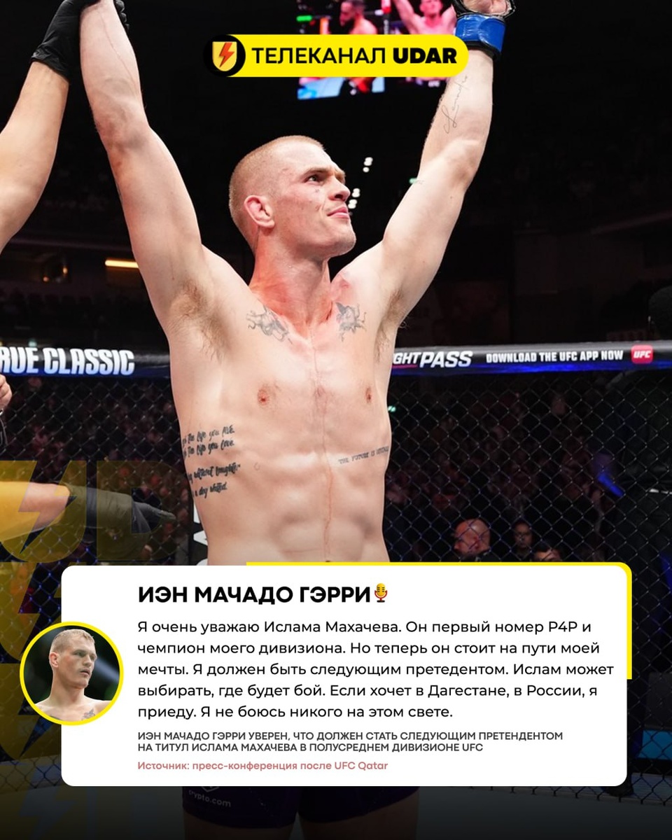 🇷🇺 Иэн Мачадо Гэрри: “Если Ислам Махачев хочет драться за пояс в России – я приеду и выйду в клетку” 🎙️Такие громкие слова прозвучали от Иэна на пресс-конференции после турнира UFC в Катаре 22 ноября. Там ирландец одолел Белала Мухаммада, экс-чемпиона в полусреднем весе, и уверен, что доказал – титульный бой должен быть его следующей остановкой: 🗣️ “В первую очередь, я очень уважаю Ислама Махачева. Он первый номер P4P и чемпион моего дивизиона. Но теперь он стоит на пути моей мечты, и это значит, что я собираюсь пробить ему дыру в голове. Я должен быть следующим претедентом. Ислам может выбирать, где будет бой. Сейчас он все контролирует. Когда он готов, где хочет. Если хочет в Дагестане, в России, я приеду. Я не боюсь никого на этом свете. У Махачева есть обязательства, как у чемпиона, драться с лучшими. В бою с Белалом я доказал, что лучший”, – заявил Иэн. 👍Поддержи наш канал cвоим голосом 📺Смотрим бои в прямом эфире ⚡ @teleudar