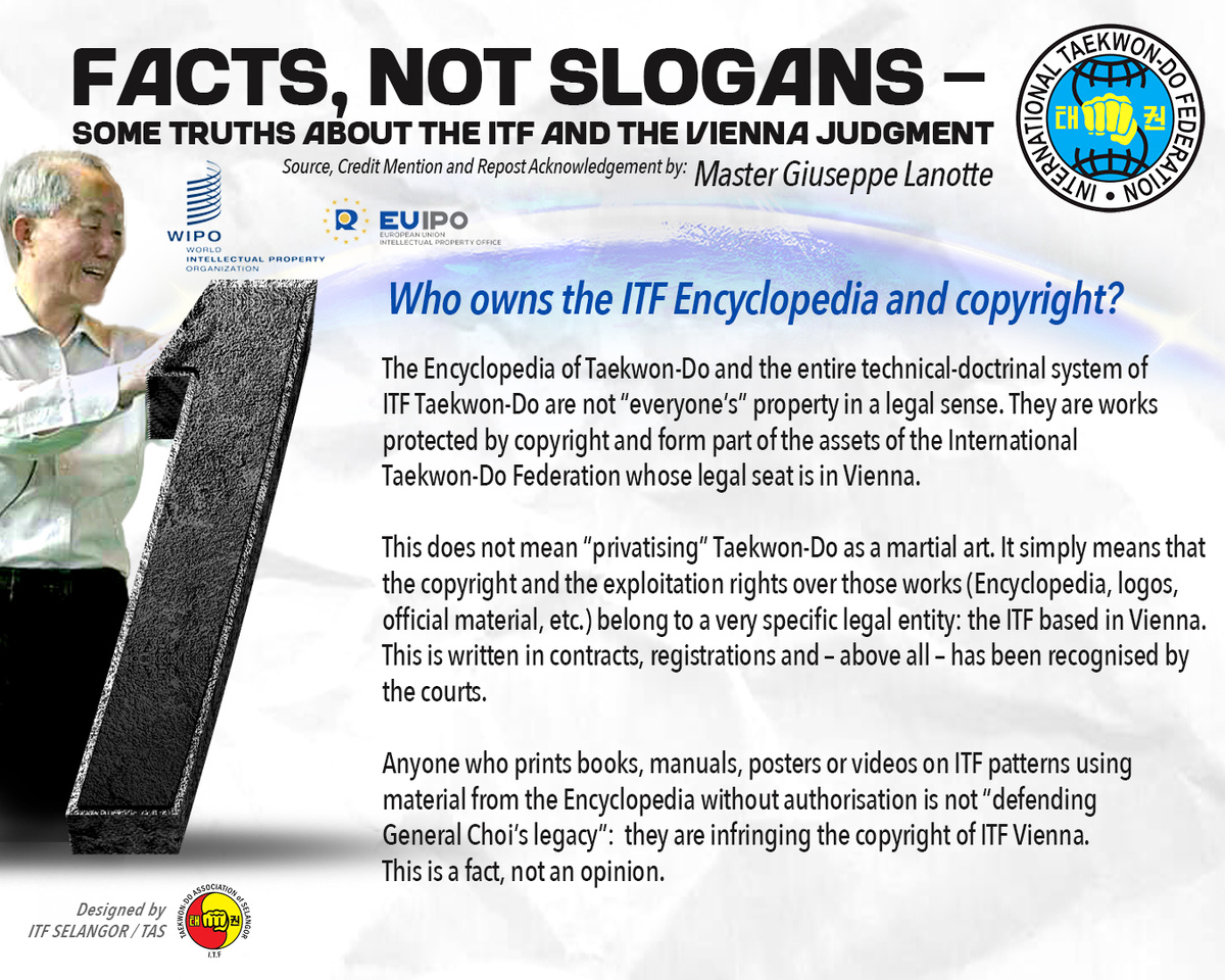 Это не означает «приватизацию» тхэквондо как боевого искусства. Это просто означает, что авторские права и права на использование произведений (Энциклопедия, логотипы, официальные материалы и т.д.) принадлежат совершенно конкретному юридическому лицу – ITF со штаб-квартирой в Вене. Это прописано в контрактах, регистрациях и – что особенно важно – было признано судами.