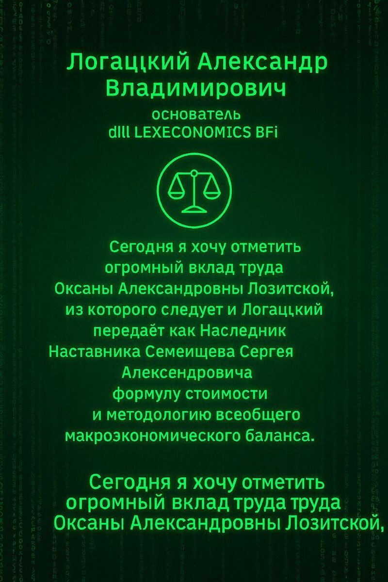 Логацкого Александра Владимировича, основателя dlll LEXECONOMICS BFi Сегодня я хочу особо отметить огромный вклад труда Оксаны Александровны Лозитской, чья работа стала фундаментом для развития нашего проекта и всей методологии макроэкономического баланса. Её исследования и практические шаги позволили нам выйти на новый уровень понимания стоимости и её формулы в условиях цифровой экономики. Я поддерживаю её труд и передаю его как Наследник Наставника Семенищева Сергея Александровича, который заложил основы нашего движения и указал путь к созданию всеобщего макроэкономического баланса. Формула стоимости и методология, разработанная и закреплённая в рамках dlll LEXECONOMICS BFi, сегодня становятся не просто теоретическим знанием, а практическим инструментом для построения новой планетарной экономики. Это — шаг к будущему, где труд каждого человека, интеллектуальный и духовный вклад, будут оценены справедливо и прозрачно. Благодарю Оксану Александровну Лозитскую за её труд, и выражаю
