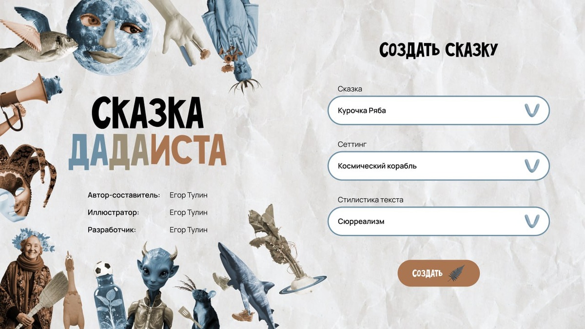 Мой проект «Сказка дадаиста» — это яркий пример подхода от режиссуры. Я взял шесть русских сказок и позволил алгоритму создавать 486 разных вариантов. Текст генерирует ИИ, а визуальные иллюстрации строятся в стиле дадаизма — как если бы газеты и вырезки буквально подверглись акробатике: «возьми ножницы… брось вырезки вверх… пусть они упадут».