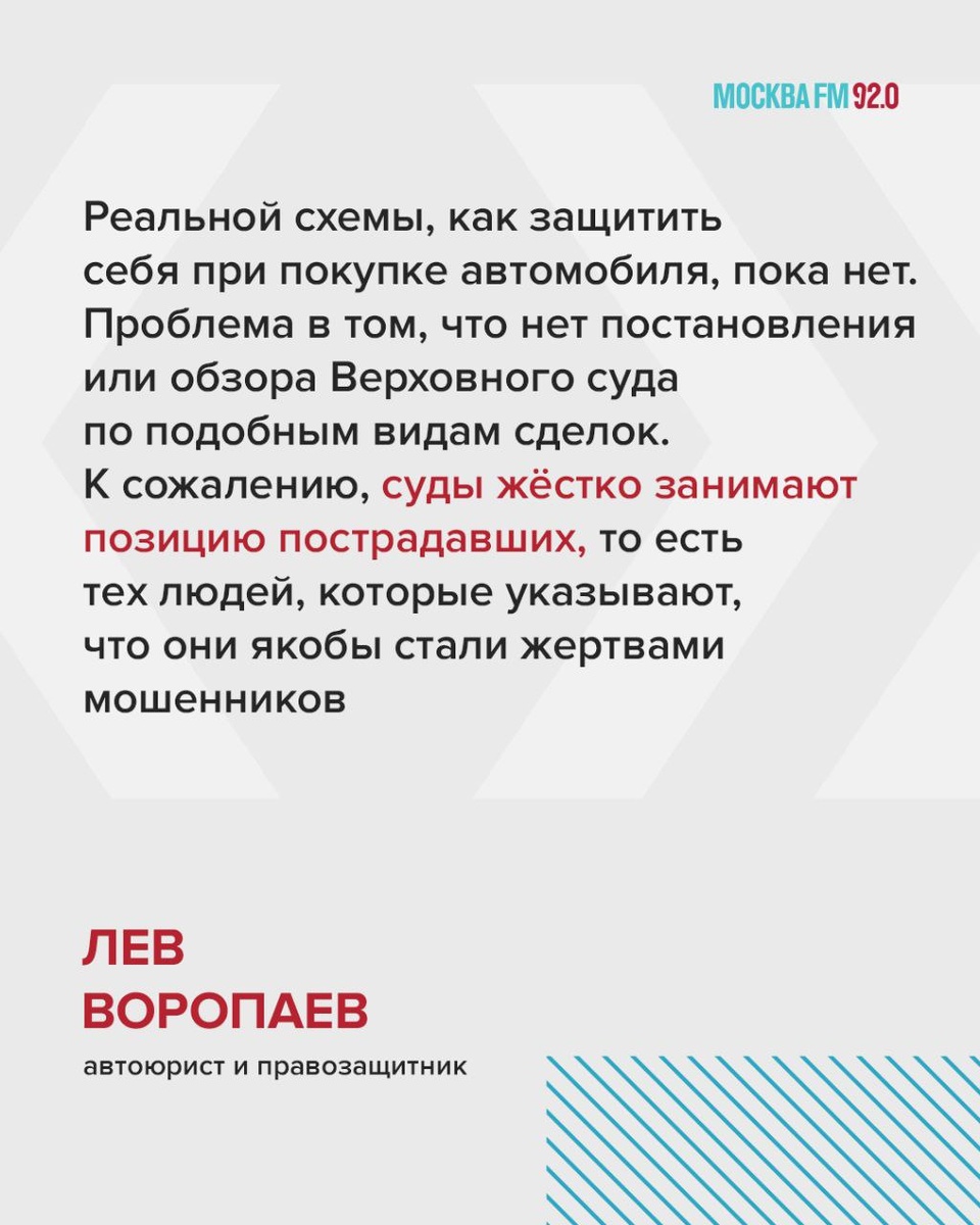 ❗️«Схема Долиной» добралась до авторынка: по всей стране у добросовестных покупателей изымают подержанные машины, которые они приобрели у пенсионерок Как сообщает телеграм-канал Baza, последний инцидент произошёл с жителем Москвы. Он купил Volkswagen Tiguan за 1,8 млн рублей у пожилой женщины. Сделка была оформлена по договору купли-продажи за наличные, и через неделю к нему приехали сотрудники МВД. От полицейских покупатель узнал, что пенсионерка под влиянием мошенников продала всё своё имущество за 27 млн рублей. Как и в схемах с недвижимостью теперь потерпевшая обратилась в суд с требованием признать покупателя недобросовестным и вернуть автомобиль. 💬 Пока что защититься от таких схем нельзя, говорит автоюрист и правозащитник Лев Воропаев К сожалению, сейчас судебная практика в подавляющем большинстве своём стоит на защите интересов вот таких граждан. Мошенников ищут, но вы же ближе и с вас проще получить имущество, на которое можно обратить взыскание, точнее, расторгнуть ту сдел