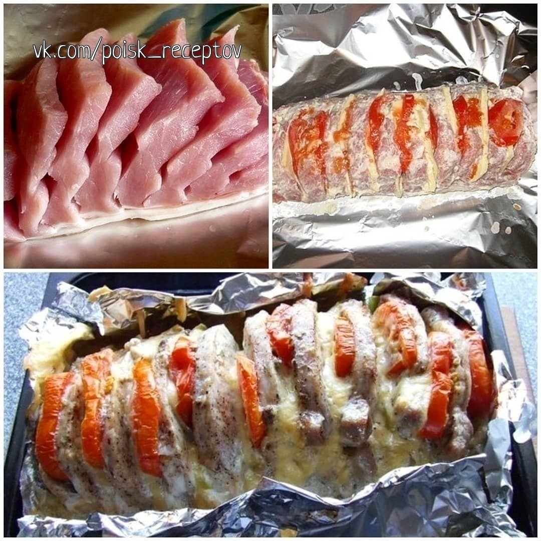 📝Ингредиенты: мясо мякоть (свинина/говядина)- 1 кг (+-) помидор- 2 шт сыр твердый- 200 гр чеснок- 3 зубчика Маринад: лимонный сок- 1 ст.л соевый соус- 2-3 ст.л горчица- 1 ст.л оливковое или растительное масло- 2 ст.л Рецепты Лучшие рецепты тут 👇🏻 📝Приготовление: Выбрать ровный (прямоугольный), плотный кусок мяса (как на буженину). На мясе сделать поперечные надрезы, не дорезая до конца. Смешать компоненты для маринада и смазать мясо со всех сторон и в надрезах, по вкусу посолить, поперчить. Оставить мясо мариноваться на 10-12 часов. Нарезать ломтиками сыр и кольцами помидоры, измельчить чеснок. В каждый надрез вложить сыр, помидор и чеснок. По желанию добавьте ломтики грибов. Мясо завернуть в фольгу, выложить на противень и поместить в разогретую духовку до 180-200 С и выпекать до готовности 50-60 минут. Готовое мясо выложить на блюдо и украсить зеленью. Можно сделать картофельные грибочки.