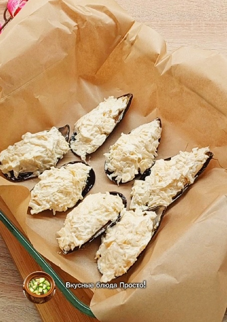 Пошаговый рецепт фото👆👆 Мидии 10шт, Сметана или майонез 2ст.л, Сыр 100гр, Чеснок 1зубчик.