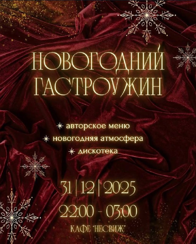 Дорогие гости! ✨Приближаются самые волшебные дни года, и мы хотим пригласить Вас отметить их по-особенному - в атмосфере уюта, праздника и, конечно же, невероятных вкусов! 🎉Предлагаем посетить Новогодний гастроужин 31 декабря в кафе «Несвиж», Вас ждут уютная атмосфера, авторские блюда от шеф-повара праздничная дискотека. Контакты: +375 (44) 739-59-64 Время проведения: с 22:00 до 03:00.