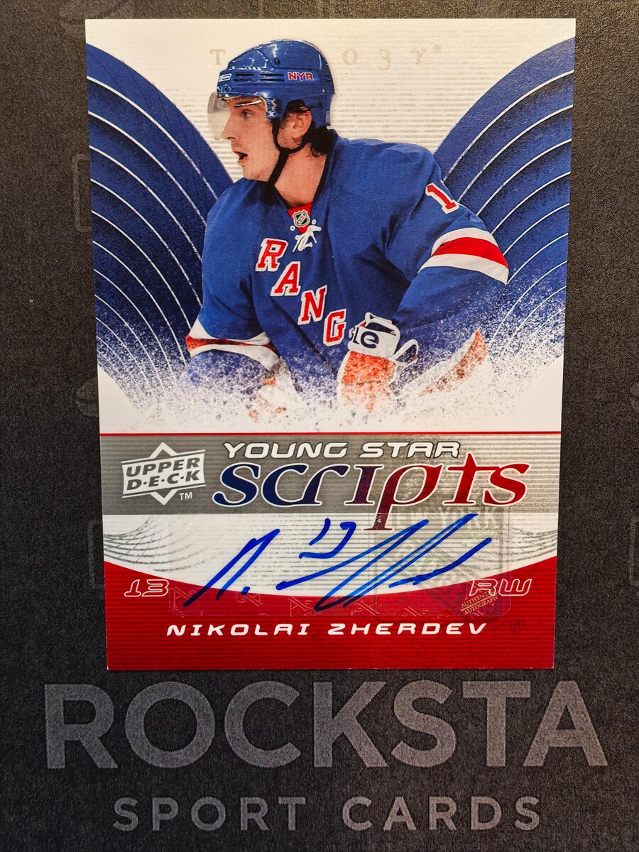 Nikolai Zherdev. Rangers. Подпись, которую уже не повторить 2 полных сезона в НХЛ с 58+ очками, и возвращение в КХЛ… Чего-то не хватило — или, наоборот, было слишком много? Когда смотришь на эту карту, будто на секунду переносишься в Нью-Йорк конца 2000-х. Там, где Madison Square Garden ревел, где #13 на правом фланге искал свой момент, а каждая смена была борьбой не только с соперником, но и с собственным характером. 🗽 Nikolai Zherdev. Игрок, который всегда будоражил — кого-то талантом, кого-то темпераментом, но равнодушных не было. И вот он тут, на плотном триилоджевском картоне, в синем свитере Rangers, с автографом, который будто поставлен на скорости. 💎 Young Star Scripts — серия, которая не про тиражи, не про золото, не про суперредкость. Она про момент, когда из новичка формируется игрок, и это фиксируется чернилами. А этот автограф — живой. Смазанный, нервный, резкий — как сам Жердев на льду. Именно за такие вещи коллекционеры и любят предыдущие годы Upper Deck: в них мн