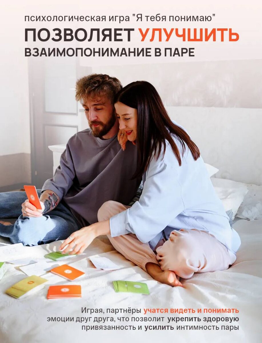 Представьте вечер, когда вы не просто сидите рядом с телефоном, а по-настоящему разговариваете. Смотрите друг на друга и открываете новые, даже для себя, грани. Знакомо? Если да, то эта игра для вас. «Я тебя понимаю» — это не просто колода карт. Это мостик между двумя сердцами. Это возможность за один вечер стать ближе, чем за последние несколько месяцев. Для кого эта игра? · Для пар со стажем, где рутина вытеснила душевные разговоры. · Для молодоженов, которые хотят заложить прочный фундамент доверия. · Для влюбленных, которые считают, что знают друг о друге всё, и готовы удивиться. · Для всех, кто верит, что самые важные открытия ждут не в путешествиях, а в глазах любимого человека. Что вас ждет в коробке? Специальные карточки с глубокими, но нежными вопросами, которые помогут: 🔹 Раскрыть чувства, которые трудно выразить в обычной жизни. 🔹 Увидеть привычные ситуации глазами партнера. 🔹 Научиться замечать и понимать эмоции друг друга без слов. 🔹 Создать атмосферу романтики, д