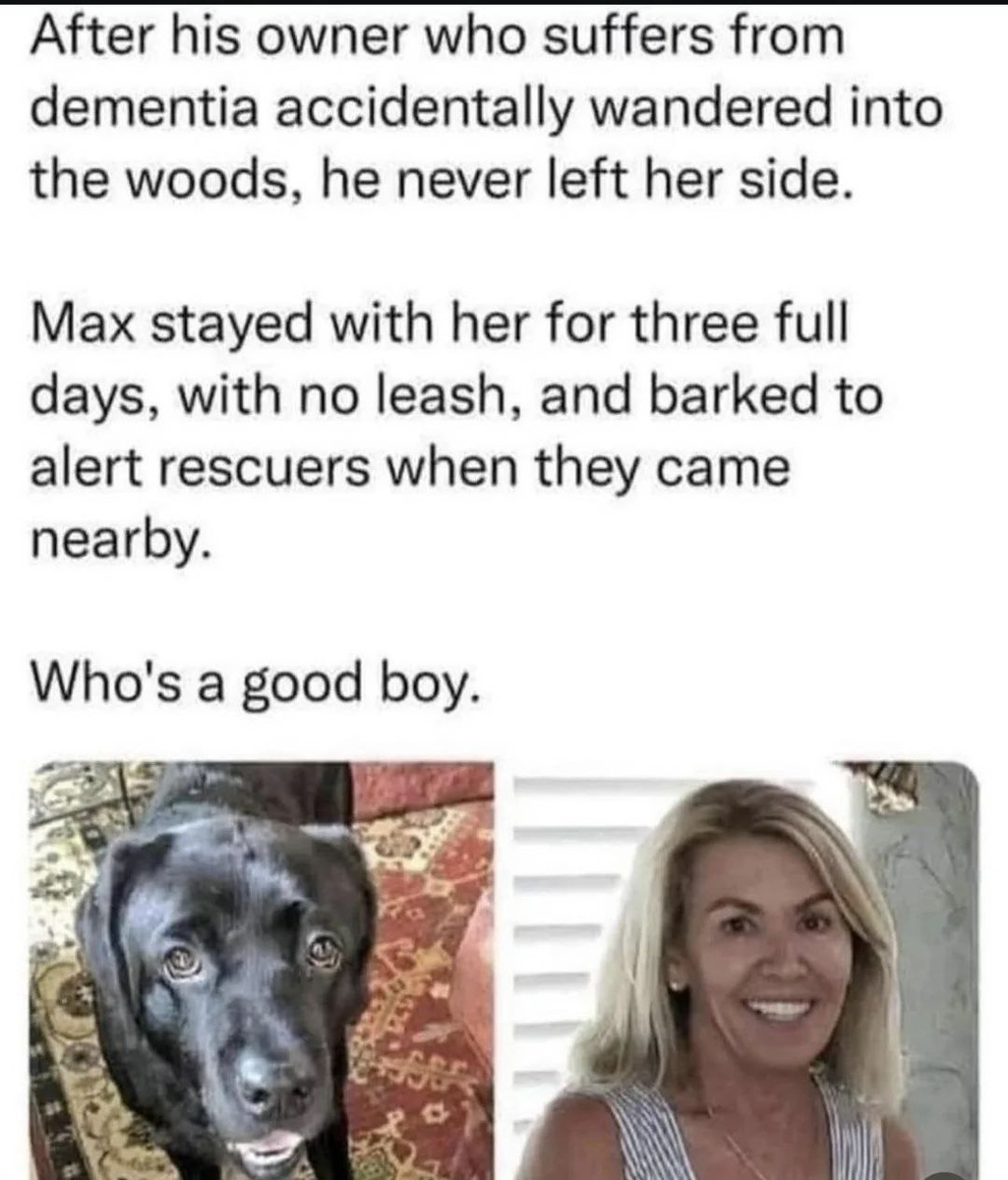 🐶После того как его хозяйка, страдающая деменцией, случайно забрела в лес, этот пёс ни на шаг от неё не отходил. Макс оставался с ней три полных дня без поводка и начал лаять, чтобы привлечь внимание спасателей, когда те оказались поблизости. 🦸Не все герои носят плащи.
