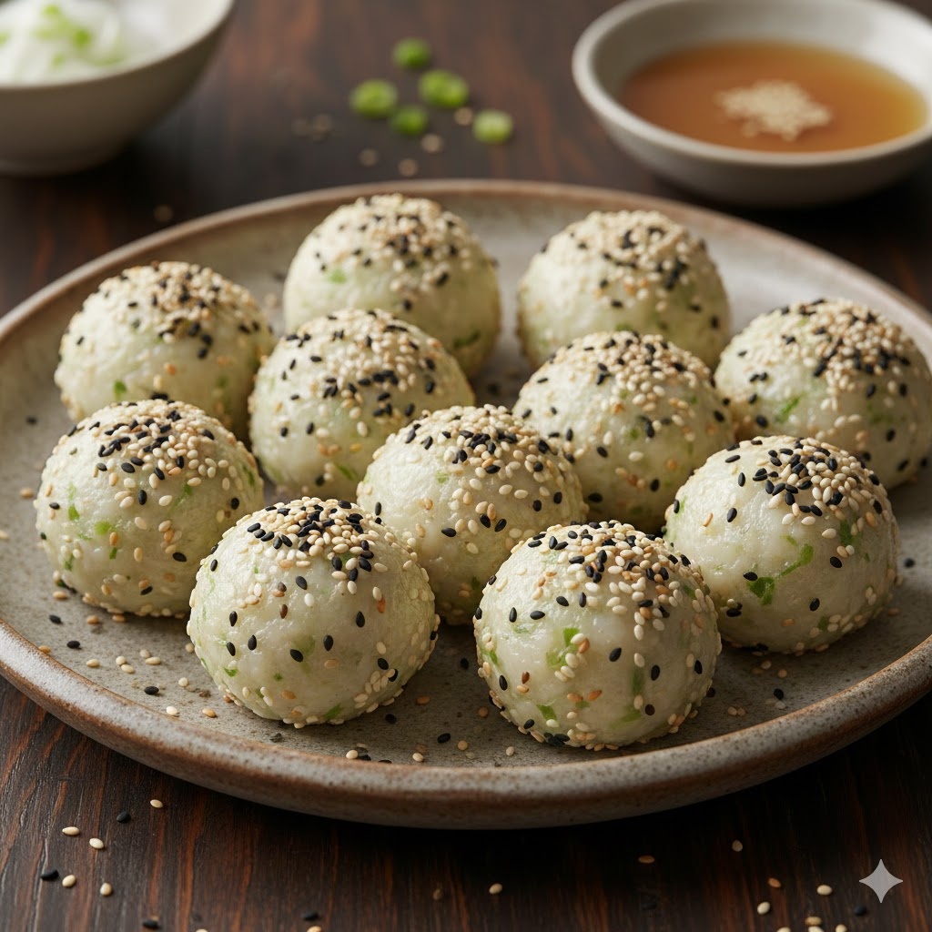 - Обвалка: Обжарьте кунжут на сухой сковороде до золотистого цвета (это усилит его аромат). Обваляйте каждый сырный шарик в кунжуте.