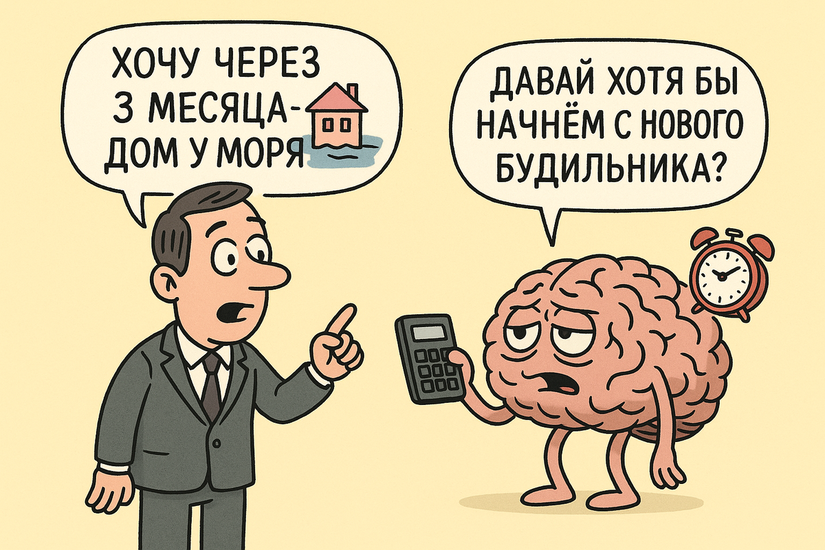 Когда человек ставит заведомо нереалистичные задачи, например, доход «сразу в сто раз больше» или резкое омоложение за месяц, тогда мозг реагирует не вдохновением, а блокировкой.
