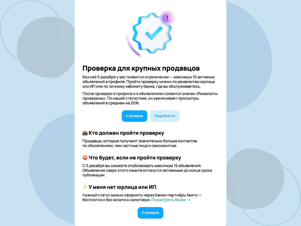 С 5 декабря платформа вводит ограничение: если вы не пройдёте проверку реквизитов - в аккаунте останется максимум 15 активных объявлений.