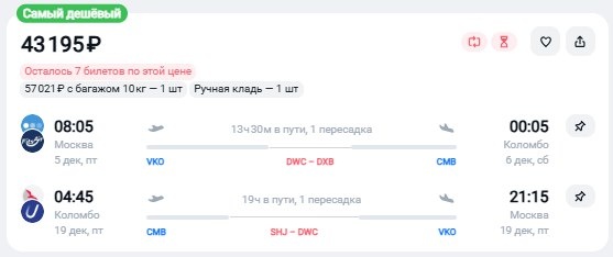 ✈️Москва - Коломбо (Шри-Ланка), туда и обратно с пересадками в ОАЭ за 43200 рублей 5 декабря - 19 декабря - https://checkintime.ru/b6ps 🏖 Поиск туров | ✈️Авиабилеты