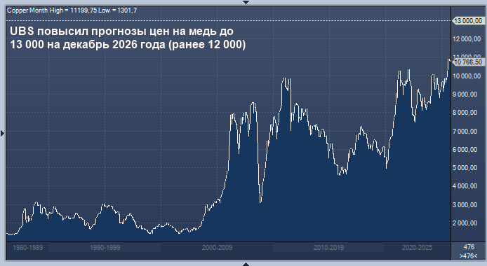 UBS повысил прогноз цен на медь: на март 2026 года — до 11 500 долларов за тонну (ранее 10 750), на июнь 2026 года — до 12 000 долларов (ранее 11 000), на сентябрь 2026 года — до 12 500 долларов (ранее 11 500), а на декабрь 2026 года — до 13 000 долларов (ранее 12 000). График цен на медь интервалами в 1 неделю UBS прогнозирует рост цен на медь в следующем году, указывая на снижение предложения из-за постоянных сбоев на рудниках и высокий долгосрочный спрос, обусловленный электрификацией и инвестициями в чистую энергетику. Об этом говорится в сообщении банка, опубликованном в пятницу. Согласно обновлённым прогнозам, UBS повысил целевые показатели цен на медь: на март 2026 года — до 11 500 долларов за тонну (ранее 10 750), на июнь 2026 года — до 12 000 долларов (ранее 11 000), на сентябрь 2026 года — до 12 500 долларов (ранее 11 500), а на декабрь 2026 года — до 13 000 долларов (ранее 12 000). Также UBS увеличил прогноз дефицита рынка: на 2025 год — до 230 000 тонн (ранее 53 000), а на