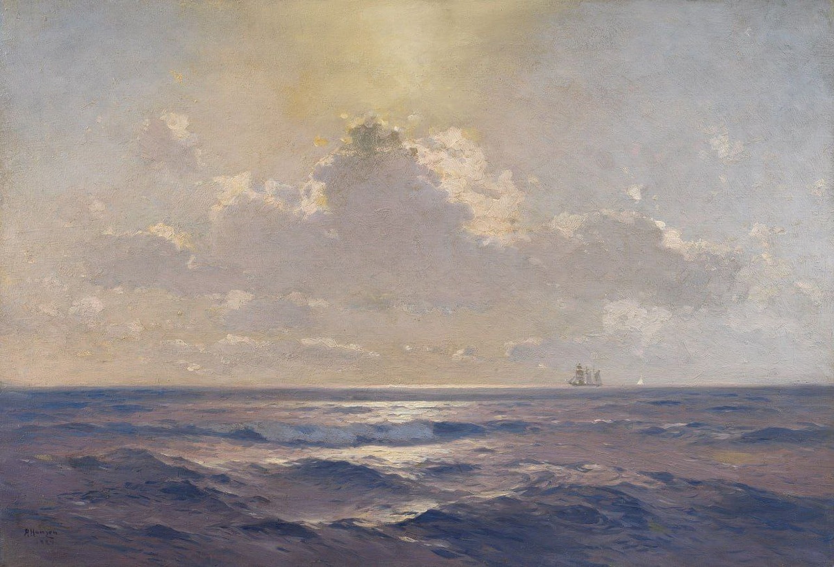 Ганзен Алексей Васильевич (1876-1937) "Морской пейзаж" Холст, масло. 54 х 78 см Ганзен — внук И. К. Айвазовского. В детстве часто бывал в феодосийской мастерской деда, увлёкся морскими пейзажами и сценами морских сражений. Ганзен писал морские пейзажи, продолжая традицию деда. Работал в основном акварелью и маслом, исполнял сепии, гуаши, гравюры. #живопись #графика #искусство