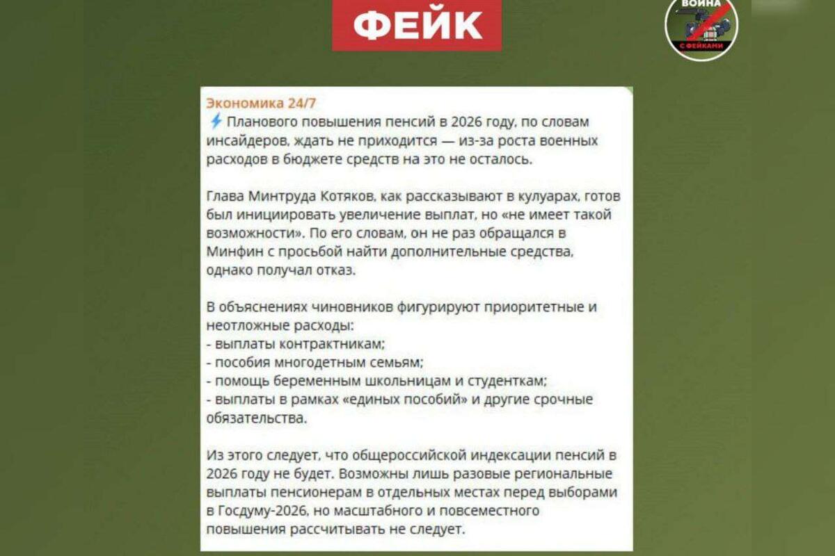 Жителей Воронежской области предупреждают о распространившейся в социальных сетях фейковой информации с отменой повышения пенсий в 2026 году. В Telegram-канале «Война с фейками» назвал ее недостоверной. На самом деле размер пенсии в России повышается ежегодно. В следующем году увеличение также пройдет в два этапа. Первый – в январе, страховые выплаты вырастут на 7,6% как у работающих, так и у неработающих пенсионеров. Социальные пенсии будут повышать в 1 апреля 2026 года, их рост составит 6,8%. Данные выплаты получают инвалиды, студенты, дети, потерявшие кормильца, сироты и жители Крайнего Севера. По словам заместителя министра труда и социальной защиты РФ Андрея Пудова, средства для обеспечения вышеуказанных выплат предусмотрены в полном объеме. Ранее «Обозреватель.Врн» сообщал об очередном фейке, связанном с пенсионной реформой. Гражданам якобы предложили выходить на пенсию на десять лет позже, что позволит получать выплаты в большем размере. На самом деле срок выхода на пенсию не из