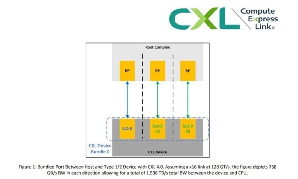 Консорциум CXL выпустил спецификацию CXL 4.0. Это новое поколение стандарта для высокоскоростного соединения между процессором (CPU) и различными устройствами (ускорителями, памятью). Технология облегчает масштабирование систем искусственного интеллекта и облачных решений, а также делает серверные архитектуры более гибкими. Основное обновление связано с переходом на PCIe 7.0 и увеличением скорости передачи данных до 128 ГТ/с, что в два раза больше по сравнению с CXL 3.x. Задержки остались на прежнем уровне, а формат FLIT по-прежнему составляет 256 байт. Появилась поддержка до четырёх ретаймеров (небольших микросхем, восстанавливающих сигнал на длинных линиях) и новая конфигурация x2, которая позволяет создавать более протяжённые и сложные топологии без ухудшения качества сигнала. Ещё одним нововведением стала технология Bundled Ports, которая позволяет объединять несколько физических портов в одно логическое соединение. При этом система видит одно устройство, но пропускная способнос