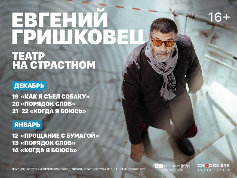 Спектакли в декабре. 01/12 - Иркутск, «Когда я боюсь». Билеты. 03/12 - Новосибирск, «Когда я боюсь». Билеты. 08/12 - Санкт-Петербург, «Когда я боюсь». Билеты. 09/12 - Санкт-Петербург, «Когда я боюсь». Билеты. 19/12 - Москва, «Как я съел собаку». Билеты. 20/12 - Москва, «Порядок слов». Билеты. 21/12 - Москва, «Когда я боюсь». Билеты. 22/12 - Москва, «Когда я боюсь». Билеты. До встречи в театре! Полное расписание на сайте.