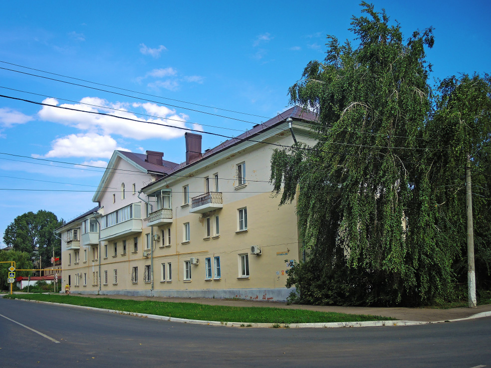Продолжаю фотопрогулку по Чапаевску, небольшому городу в Самарской области. Был здесь два раза летом 2025 года. Все материалы можно найти по ссылке в конце статьи. Мы снова вышли на улицу Ленина, одну из самых длинных в историческом центре города. Я уже показывал большую подборку фотографий с этой улицы, сделанных во время первой прогулки, в мае. В августе, во время второй прогулки, сделал некоторые дополнения к тому рассказу. На этот раз мы пройдём в обратном направлении, в сторону увеличения нумерации домов. Дом 27. Находится рядом со сквером вокруг храма Сергия Радонежского. Год постройки - 1953. Вид храма в перспективе улицы. И его, и сквер по состоянию на май и август 2025 я уже показал. Подборки можно найти по общей ссылке в конце статьи. Дома на пересечении с улицей Пионерской мы осмотрели отдельно в предыдущей части. Здание на пересечении с улицей Куйбышева. Какой-то то ли недострой, то ли недоремонт. Судя по всему, должно было быть современным торговым центром, но по какой-то