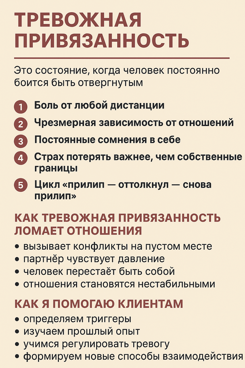 Человек вроде любит — искренне, глубоко, всем сердцем. Но одновременно с этим внутри живёт постоянный страх: «Он уйдёт. Она разлюбит. Я недостаточно хорош(а)». Это и есть тревожная привязанность — скрытый механизм, который незаметно разрушает отношения, постепенно съедая доверие, спокойствие и ощущение безопасности. За годы работы я увидела, как часто люди страдают не от партнёров, а от того, что происходит внутри них самих. Сегодня расскажу, как тревожная привязанность проявляется и как мы с клиентами шаг за шагом её исцеляем. Это состояние, когда человек постоянно боится быть отвергнутым.