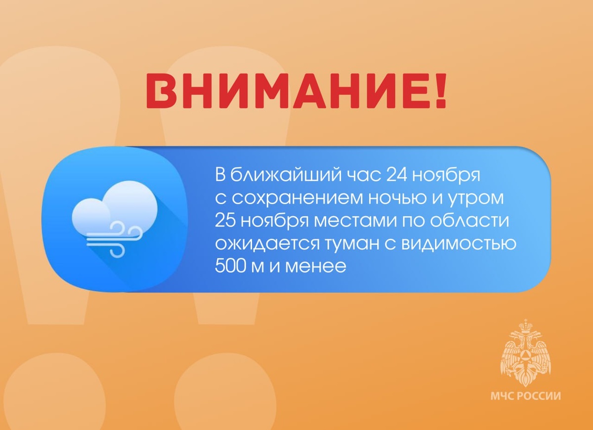 В ближайший час 24 ноября с сохранением ночью и утром 25 ноября местами по области ожидается туман с видимостью 500 м и менее