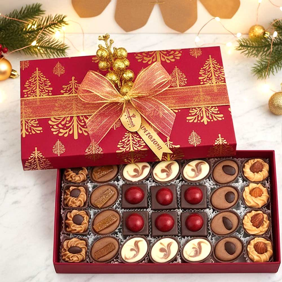 Рекомендуем обратить внимание на новогодний набор шоколада и конфет ручной работы, упакованный в формате стильной менажницы. Такое решение позволит сразу украсить праздничный стол и вместе насладиться изысканными вкусами. Этот подарок – способ без слов сказать: «Ты – королева в нашем доме».