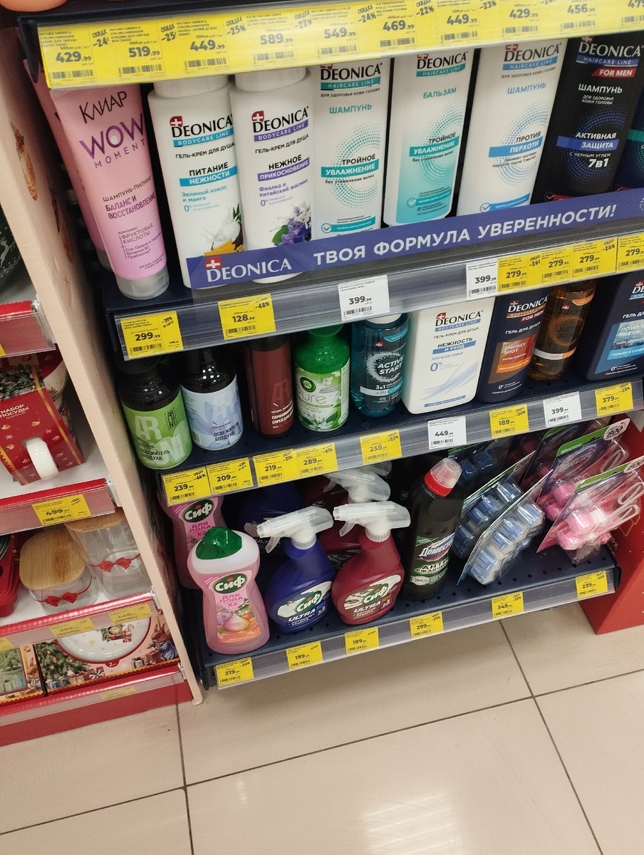 Сегодня так хотелось заглянуть в "Магнит Косметик", что аж словами сложно описать - получила зарплату и подумала, так почему бы не потратиться чуть-чуть на себя, не придерживаясь списка покупок, который обычно составляю? Правда итог все равно получился предсказуемым, незапланированно потратилась только на то, что привлекло внимание большими скидками, сопровождающимися мыслями "это все равно рано или поздно понадобится", а то, что действительно понравилось, я так и не купила. Но да ладно, не будем расстраиваться, давайте лучше я покажу некоторые новинки из магазина, а заодно поделюсь скидками, уверена, что они помогут сделать шоппинг куда более удачным. Здесь, в общем-то, всегда можно увидеть большое количество желтых ценников, но далеко не каждый из них получил бы похвалу. Но перейдем к самому интересному: До этого дня и не знала, что "Deonica" делает не только дезодоранты, только и подумать не могла, что меня заинтересуют цены в первую очередь. Вы посмотрите, их гель-крем для душа пре