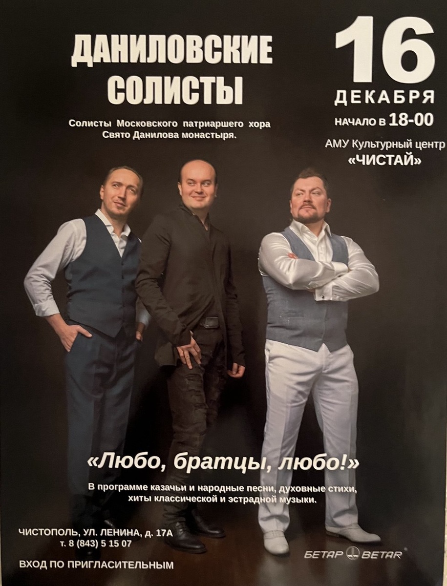 16 декабря культурный центр «Чистай» наполнят яркие голоса и живая энергия настоящей музыкальной традиции. На сцене - Даниловские солисты, солисты Московского Патриаршего хора Свято-Данилова монастыря. В этот вечер вы услышите: 🎵казачьи и народные песни 🎵духовные стихи 🎵хиты классической эстрадной музыки Это не просто концерт - это атмосфера силы, тепла и единения, которая невозможна без вас. 📅 16 декабря ⏰ 18:00 📍 Чистополь, ул. Ленина, д. 17а 🎟 Вход по пригласительным билетам ☎️ Справки: 8 (843) 51507 Приходите всей семьёй, приводите друзей - давайте сделаем этот вечер по-настоящему душевным!🫶 Будет любо! ❤️