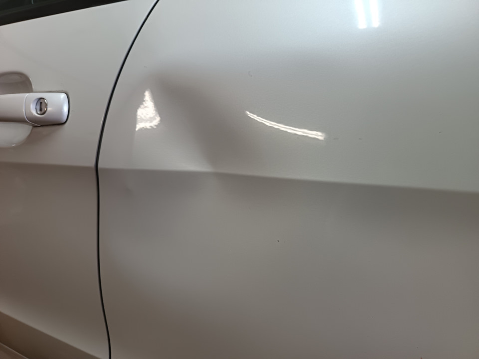 В этот раз удар пришёлся чётко в ребро двери и погнул его. Не смотря на это мы взялись выполнить выправление вмятины с сохранением краски по технологии PDR.