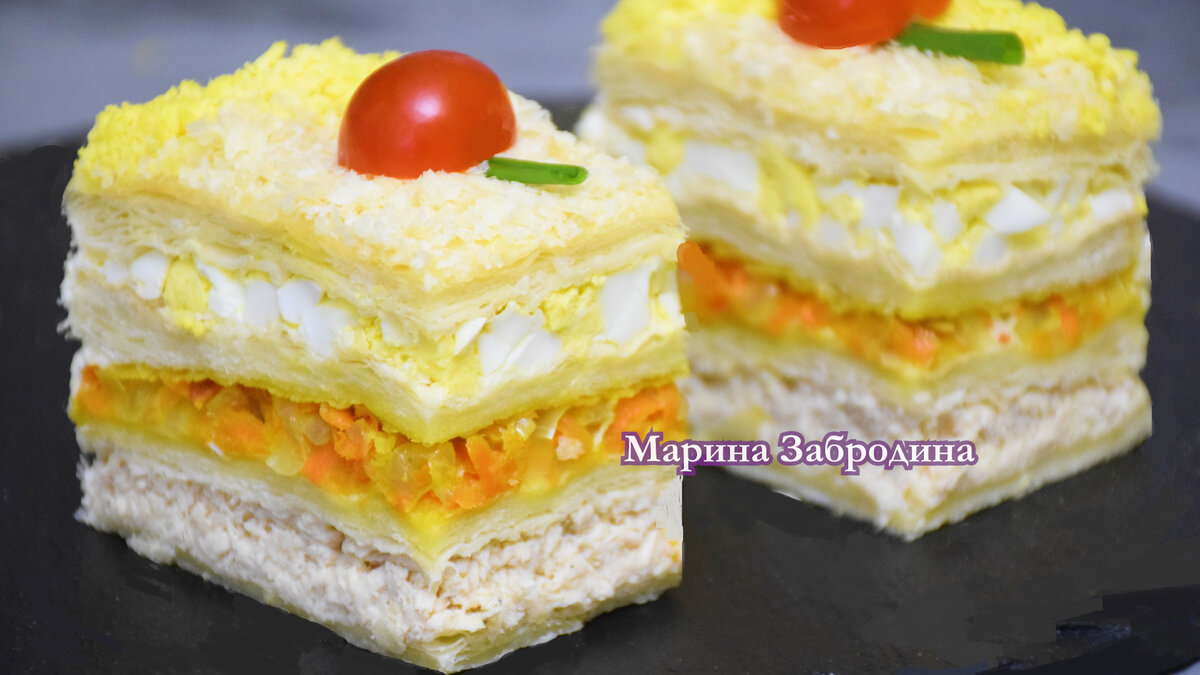 Всем привет! Сегодня предлагаю попробовать закусочный торт "Наполеон". Это вкусное блюдо готовится довольно просто. Каждый корж можно поделить вдоль на 2 части, таким образом они лучше про питаются. Начинку выбирайте по своему вкусу. Курицу можно заменить на консервированную рыбу, получится тоже вкусно. ПРОДУКТЫ ДЛЯ РЕЦЕПТА ВЫ НАЙДЁТЕ В КОНЦЕ ЭТОЙ СТАТЬИ. 1. Готовить эту закуску я буду из готового слоеного бездрожжевого теста. У меня 4 пластины по 250 гр. Раскатываю каждую размером 25 х 18 см. Вилкой тесто накалываем часто, для того чтобы оно равномерно поднималось при выпечке. коржи в заранее разогретой до 180 градусов духовке, около 15-20 минут. 2. В это время готовим начинку: яйца отварить до готовности. Куриное филе нарезать на кусочки и обжарить 5 минут на среднем огне, затем накрыть крышкой и подержать на огне еще 10 минут. Добавить специи и соль по вкусу, перемешать. Из курицы выделится бульон. Его не выливаем. 3. Измельчить готовую курицу на мелкие кусочки, мне удобнее это сде