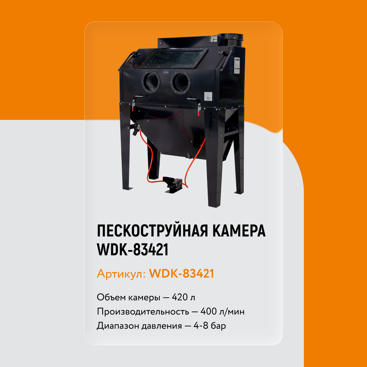 Напольная пескоструйная камера WDK-83421 объемом 420 литров – это простой и надежный инструмент для зачистки деталей. Камера позволяет работать как через фронтальную дверь, так и через боковой люк, поэтому в нее легко загружать крупные и тяжелые предметы любой формы. Принцип очень прост! Деталь ставят внутрь, оператор через прочные резиновые перчатки направляет струю абразива под давлением – так эффективно снимают ржавчину, старую краску, окалину, формовочный грунт, заусенцы и выравнивают поверхность. Устройство работает от сжатого воздуха и не требует отдельной площадки – встроенный фильтр и вытяжной блок WDK-83353 удерживают пыль внутри и очищают воздух, поэтому камеру можно ставить в закрытом помещении. Хотите заказать или получить консультацию? Тогда переходите на сайт или звоните по номеру +7 (812) 320-30-80.