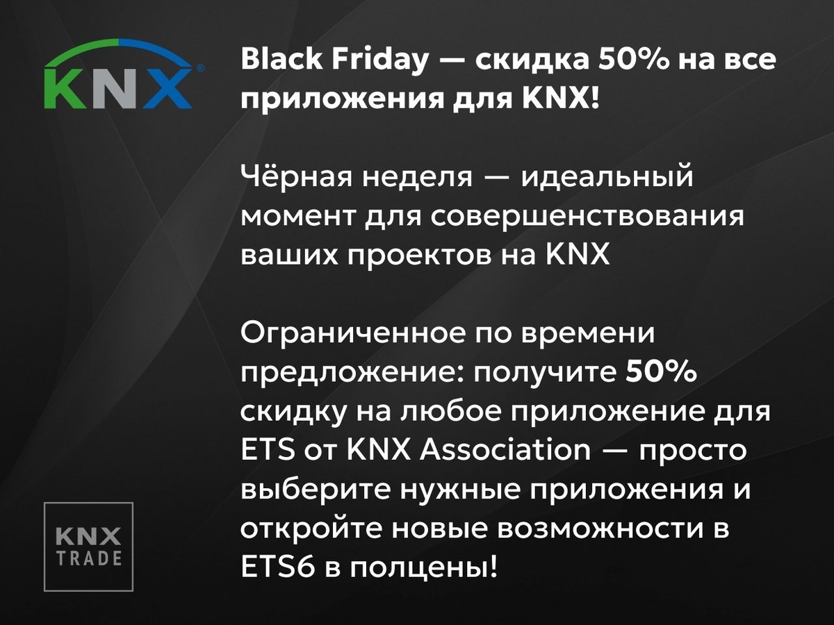 ЧЁРНАЯ ПЯТНИЦА KNX Период действия акции: с 24 ноября 2025 10:00 по CET – до 30 ноября 2025 23:59 по CET Условия: Предложение действует только на приложения для ETS от KNX Association Промокод: BLACKFRIDAYALLKNXAPP50%OFF8FPBBWFAR ETS Apps: https://oml.pw/1jaqv7vsc