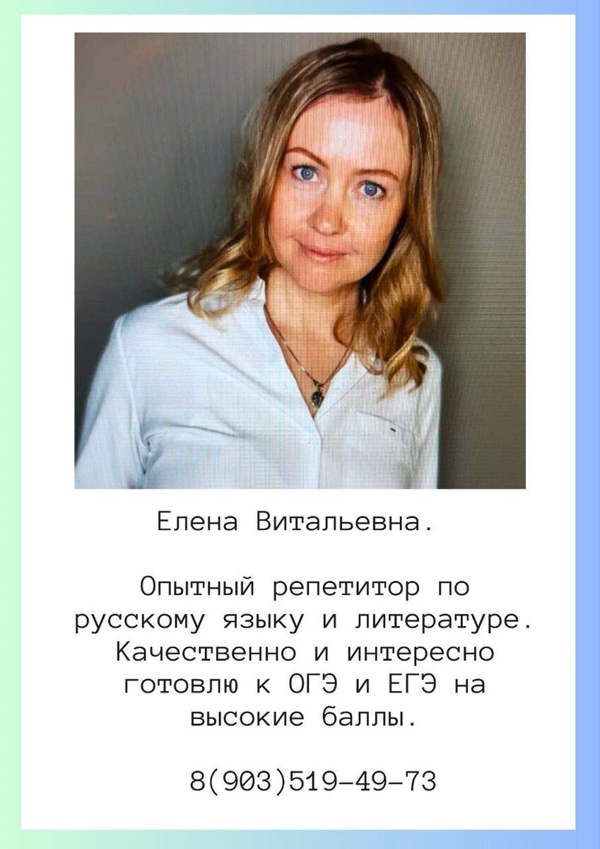 🤗Добрый день, друзья! 🍁 Хорошие новости для тех, кто ищет специалиста для подготовки сдачи экзаменов по русскому языку и литературе - хочу представить и порекомендовать вам Елену Витальевну! 🎩 Коротко о самом важном: Елена Витальевна. Опытный репетитор. Готовлю к сдаче ЕГЭ по русскому языку на высокие баллы. Со мной вы научитесь писать " безопасные" сочинения, повысите грамотность и сможете уверенно решать тестовую часть. 🎃 По всем вопросам: Телефон 8(903)519-49-73 🧁 С любовью ваша Муза!