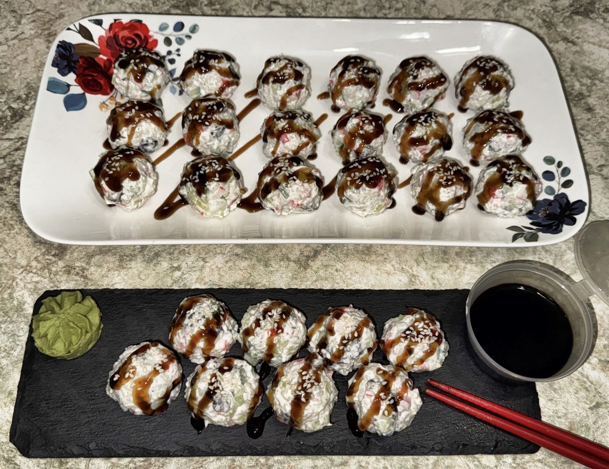 Хотите удивить гостей необычным блюдом японской кухни, но не хотите тратить много времени на приготовление сложных суши? Тогда этот рецепт именно для вас! Ингредиенты: Инструкция приготовления: Шаг 1: Подготовка риса. 1. Промойте рис холодной водой до прозрачности воды, примерно 8-10 раз. 2. Отварите рис согласно инструкции на упаковке. 3. Дайте остыть примерно до комнатной температуры. 4. В рис добавить соль, сахар и рисовый уксус. Шаг 2: Нарезка ингредиентов. 1. Нарежьте крабовые палочки мелким кубиком. 2. Огурец помойте и нарежьте так же кубиком. 3. Листы нори разрежьте на небольшие кусочки размером примерно 1х1 см. 4. Смешайте все ингредиенты с творожным сыром. Шаг 3: Формирование роллов-шариков. Шаг 4: Украшение и подача. 1. Готовые роллы-шарики полить соусом терияки. 2. Посыпать кунжутом. 3. Повторите процесс формирования остальных роллов. 4. Подавайте с соевым соусом и васаби. Эти быстрые ленивые роллы-шарики станут отличным вариантом для перекуса или закуски на вечер