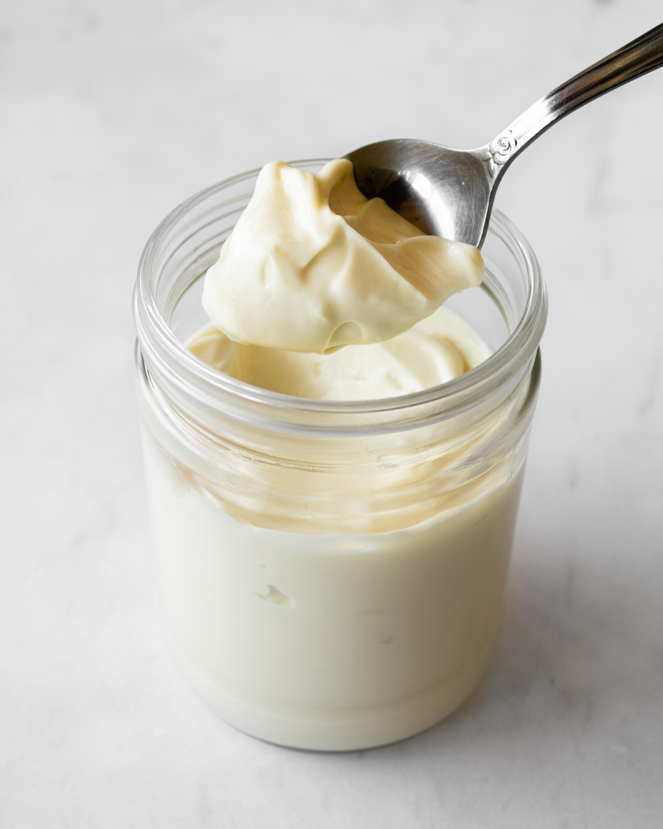 Если хочется майонеза, то только домашнего! А как его приготовить рассказали ниже. 1 яйцо 1 стакан легкого оливкового масла сок ½ лимона 1 чайная ложка столовой горчицы (или ½ чайной ложки молотой горчицы в порошке) щепотка соли Разбейте яйцо в банку, горлышко которой достаточно широкое, чтобы в нее поместился погружной блендер, или в высокий стакан для блендера, следя за тем, чтобы желток не повредился. Добавьте горчицу, щепотку соли и лимонный сок. Аккуратно влейте масло, стараясь не повредить желток. Вставьте погружной блендер так, чтобы он касался дна банки, убедившись, что лезвия полностью покрывают желток. Взбивайте 20 секунд, не поворачивая ничего, пока содержимое банки не станет похоже на майонез — белое и густое. Сверху останется немного масла, но это нормально. Теперь подвигайте погружным блендером вверх-вниз, чтобы перемешать и собрать остатки масла. Попробуйте соус на вкус, затем при необходимости добавьте еще лимонного сока или соли. Еще раз пробейте майонез, что