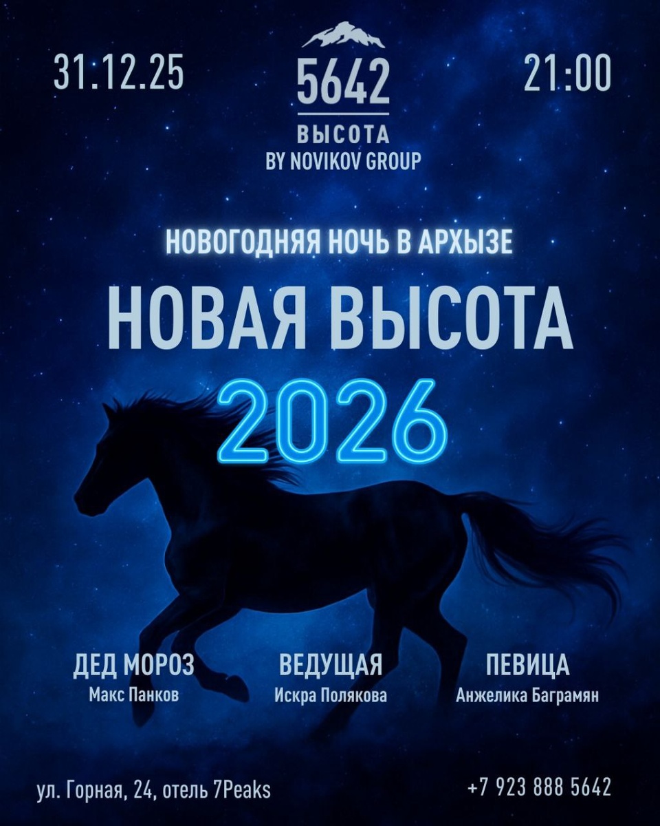 НОВОГОДНЯЯ НОЧЬ 2026 НА ВЫСОТЕ Ресторан «Высота 5642» by Novikov Group приглашает вас на событие исключительного уровня — ночь, где объединяются статус, стиль и безупречный сервис. Роскошная атмосфера, гастрономическое совершенство и изысканная программа вечера, продуманная до мельчайших деталей. В программе: — Изысканное праздничное меню от бренд-шефа Эльдара Исаева — Ведущая федерального уровня, выпускница школы Первого канала — Искра Полякова — Финалистка проекта «Голос» — Анжелика Баграмян — Виртуоз аккордеона — Виталий Кирнов — Кавер-группа «Очень Красивые» — DJ-сет от TONI — Шоу-перформанс «Дед Мороз в шпагате» — Макс Панков — Огненно-динамичное шоу FЁKI — Фотограф — Юрий Бух 📍 Локация: 7Peaks Family Resort, ресторан «Высота 5642» 🕘 31 декабря | Начало в 21:00 ☎️ Для бронирования: +79238885642 Это не просто Новый год — это новая высота вашего праздника. 📲Подписывайтесь на наши социальные сети: Instagram: https://www.instagram.com/vysota_5642_arhyz?igsh=NG9zcmZmd2J3c3M5 T