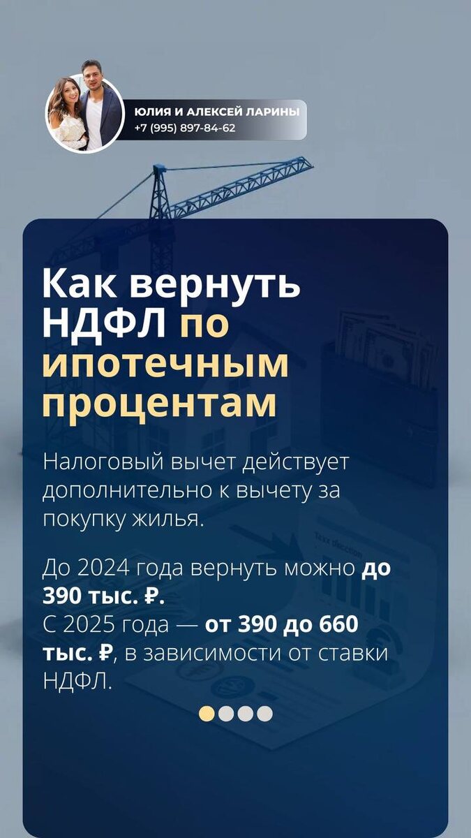 Как вернуть НДФЛ по ипотечным процентам Помимо налогового вычета за покупку недвижимости, закон позволяет получить вычет за проценты по ипотеке. Сумма к возврату – до 390 тыс. руб. до 2024 года. С 2025 года с вводом пятиступенчатой шкалы налогообложения сумма налогового вычета за проценты по ипотеке составляет от 390 до 660 тысяч рублей в зависимости от ставки НДФЛ. Правом вычета обладают физлица, которые работают официально, либо платят НДФЛ самостоятельно и только за один объект недвижимости. Подавать документы можно каждый год, а декларации принимают за последние 3 года. Если сумма налогов меньше суммы налогового вычета, то он переносится на следующий год — и так, пока весь вычет не будет «исчерпан». Важно помнить, что вычет не дадут: по военной ипотеке, апартаментам и объектам, купленным у близких родственников. Оформить возврат можно через налоговую или через работодателя — тогда НДФЛ временно перестанут удерживать из зарплаты. Право на налоговый вычет возникает после пол