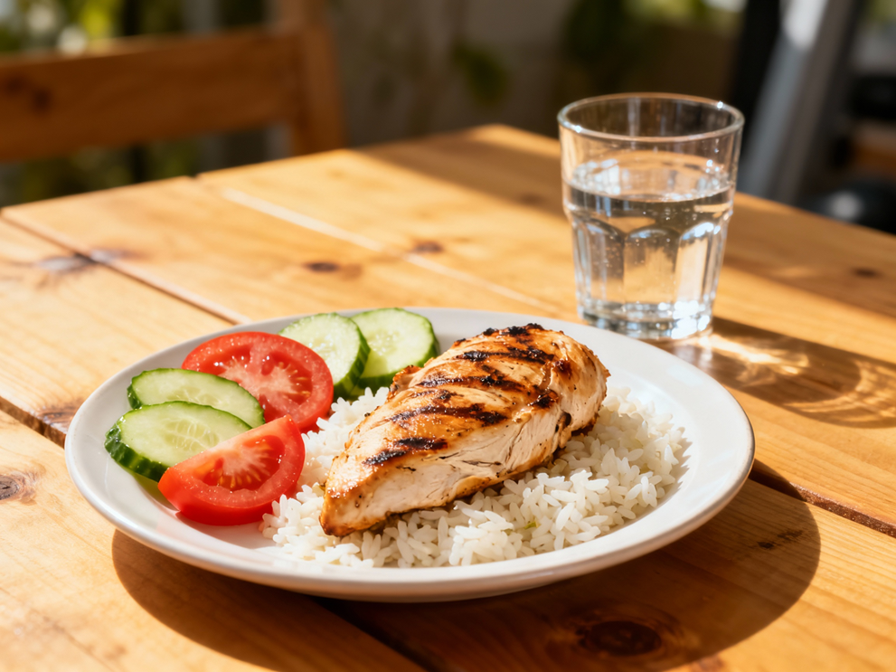 · Куриная грудка с рисом и свежим овощным салатом (помидоры, огурцы, капуста). Классика, которая работает.