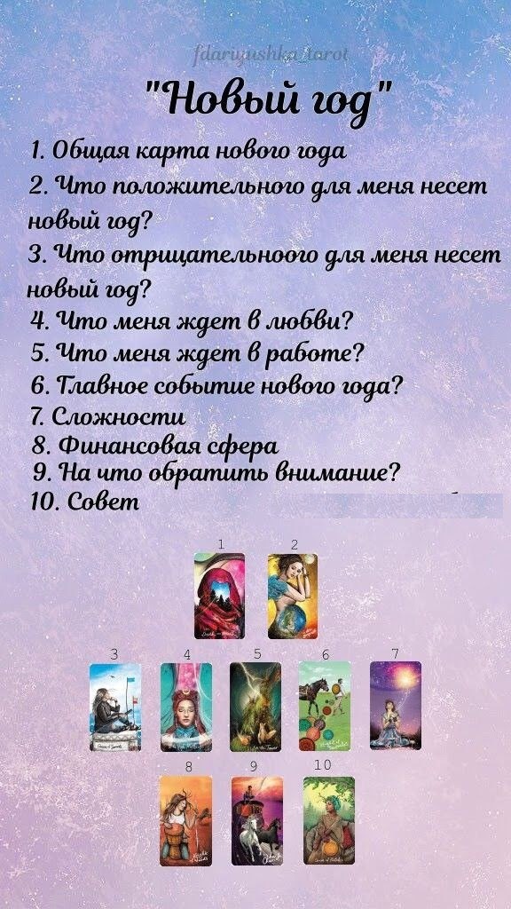 Ну что, коллеги-тарологи, готовы к марафону годовых прогнозов? С годовыми раскладами наблюдаю интересную закономерность. В большинстве случаев крупные расклады не оправдывают себя, чтобы разобраться в ситуации мне, например, достаточно 6-8 карт. Но годовые расклады лучше сразу делать на ковре, они будут состоять минимум из 10 позиций. Привожу вам в качестве примера схему самого простейшего, самого банального годового расклада. Тут я бы могла поспорить с точностью формулировок, но - не буду. Схема логичная? Понятная? Всё ли есть, что нас может интересовать? Тогда берите в работу. В этом раскладе нет позиции, которая касалась бы здоровья, я бы её добавила. Ещё я грущу, когда из годовых раскладов выкидывают позицию про обучение. Если вы закончили школу 10 лет назад, это ещё не значит, что вы прекратили учиться. А ещё 9 и 10 позиция дублируются по смыслу, но вы и так знаете, что карта "Совет" в большинстве раскладов лишняя. Множество тарологов используют в качестве годового расклада "12