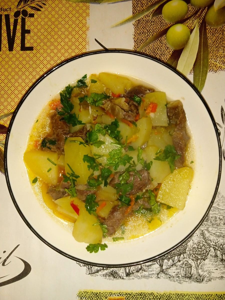 Для приготовления жаркого вам понадобится: говядина - 1 кг., картофель - 2 кг., морковь - 1 шт., лук репчатый - 1 шт., перец болгарский -1 шт., чеснок - несколько зубков, зелень - 1 пучок, растительное масло - 1 ст. ложка, вода, соль, специи - по вкусу. В глубокую посуду налить немного растительного масла. Когда масло закипит, выложить нарезанную говядину. Говядину тушить до готовности на среднем огне, посолить перед добавлением других ингредиентов. Добавить нарезанную морковь и репчатый лук, перемешать. Добавить мелко нарезанный болгарский перец. Я люблю мелко нарезать овощи, кто-то любит крупно, на вкусе это не сильно сказывается. Когда морковь и лук станут мягкими, высыпать нарезанный картофель. Залить водой. Если вы не любите много воды, можно залить водой так, чтобы содержимое лишь наполовину было в воде. Так как блюдо тушится под крышкой, картошка сварится, только иногда в процессе надо помешивать и добавлять воды, если выкипела. Нарезать зелень и чеснок. Когда картофель начнет