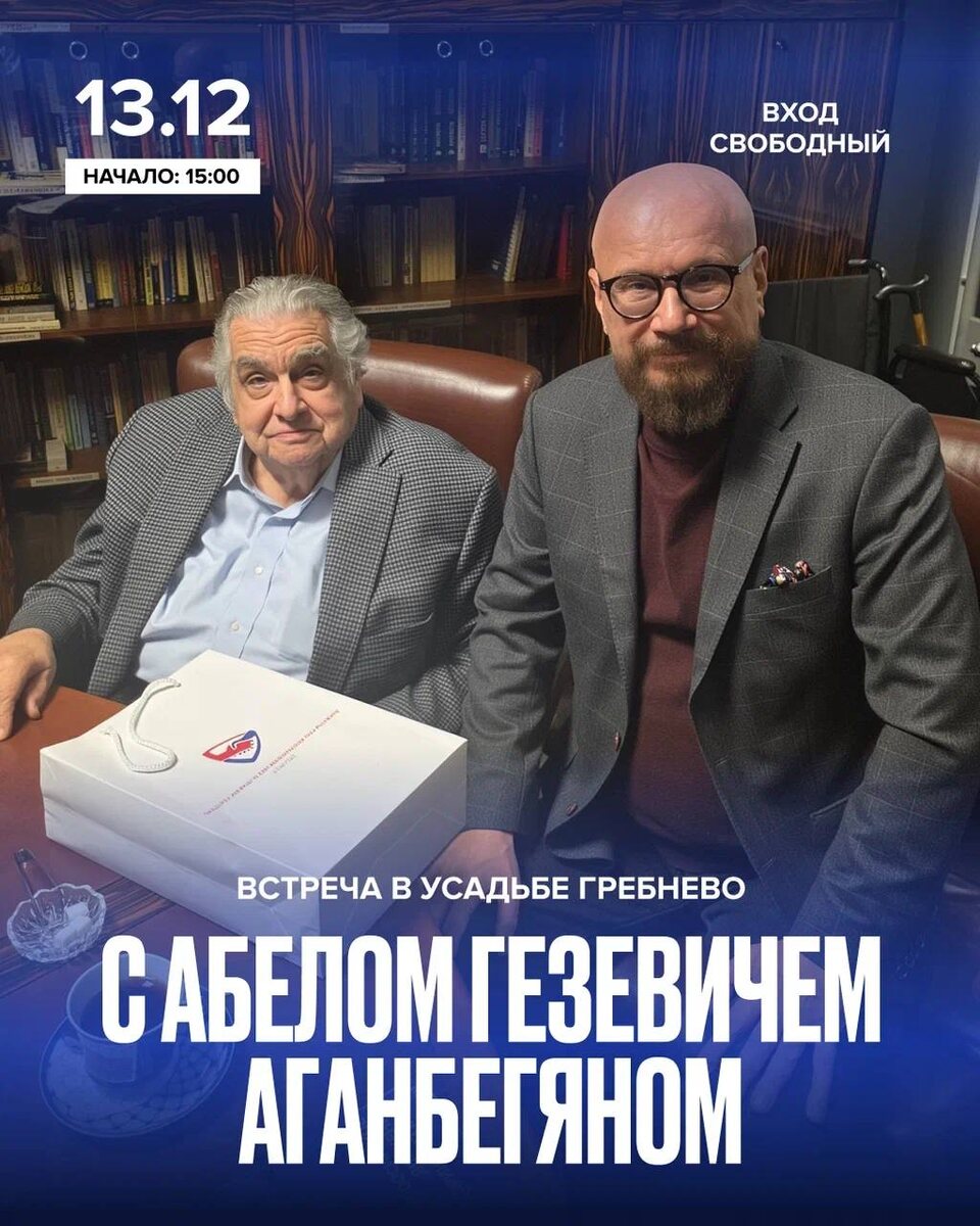 Друзья, приглашаю всех 13 декабря в 15:00 в усадьбу Гребнево на встречу с Абелом Гезевичем Аганбегяном — выдающимся советским и российским