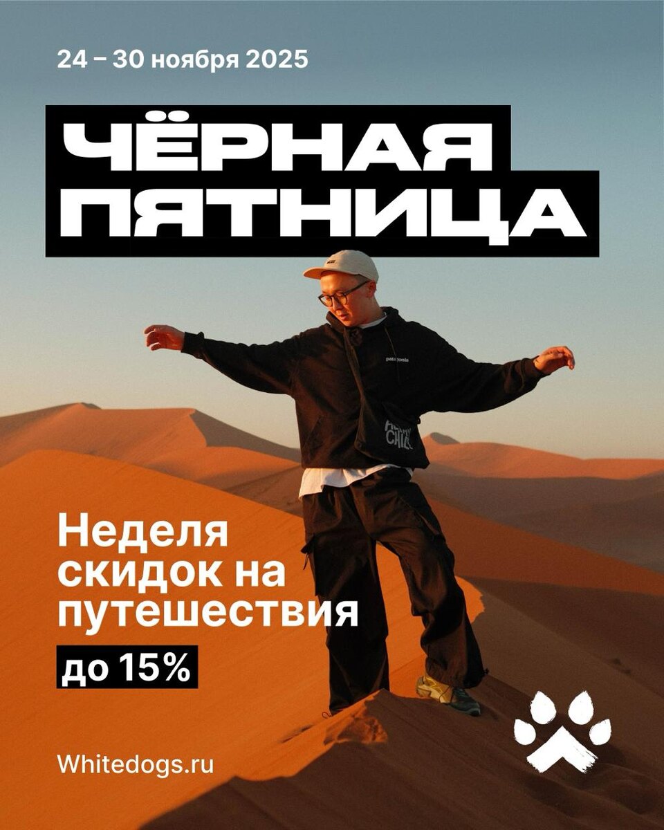 Черная пятница в Племени Белых Псов ⚡️ С 24 по 30 ноября вы можете забронировать путешествия со скидками до 15%. 📍Выбирайте, куда отправитесь в 2026: — на новые направления действует скидка 15%. — на все остальные путешествия — скидка 10% 🏔Направления со скидкой 15%: Намибия 2235$ 2630$ Сокотра 2370$ 2790$ Ликийская тропа + комфорт 1095$ 1290$ Мадейра 2500$ 2950$ Виа - Феррата в Доломитовых Альпах 1224€ 1440€ Черногория 1130€ 1330€ Камчатка 160 500 р. 189 000 р. Мото - тур через Гималаи в Ладакх 3060$ 3600$ Восхождение на Арарат 1317$ 1550$ ⚡️Как получить скидку? — Ознакомьтесь с расписанием походов и путешествий на 2026 год. — Определитесь с направлением, о котором давно мечтали. — Свяжитесь с нашим менеджером — он поможет с выбором и ответит на все вопросы. 🤝Что нужно для бронирования? — Внести предоплату 30% от стоимости тура или похода (с учетом скидки). * скидка действует только на новое бронирование и не суммируется с другими скидками. До встречи в новых местах и п